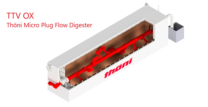 TTV Thöni OX, to unikalna komora fermentacyjna z przepływem tłokowym w wersji mikro. Została ona stworzona do fermentacji odpadów organicznych i przeznaczona jest do eksploatacji na miejscu ich wytworzenia. Przepustowość 220 - 500 Mg/rok.