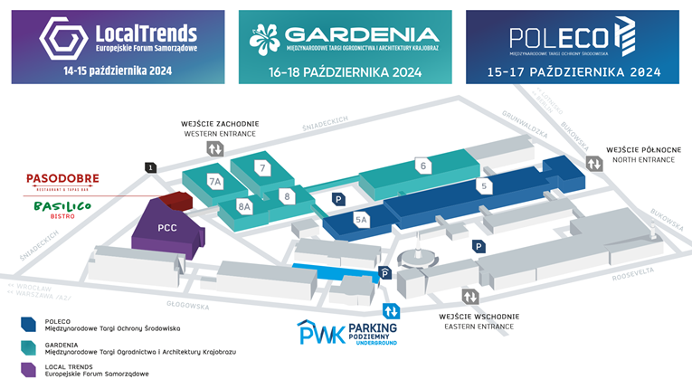 Ekspozycja targów POLECO 2024 zlokalizowana będzie w pawilonie nr 5 i 5A. W tym samym czasie odbywają się Local Trends – Europejskie Forum Samorządowe (14-15.10) oraz Międzynarodowe Targi Ogrodnictwa i Architektury Krajobrazu GARDENIA (16-18.10).