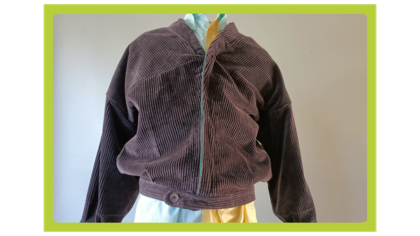 Produktem jest kurtka typu bomberka. Jest to rodzaj okrycia wierzchniego popularnego wśród młodych ludzi, ale też każdego kto ceni wygodę i elegancję, ale też trochę luźniejszy fason. Wyróżnia ją nietypowy, oryginalny fason jak również to, że w 99% została wykonana z materiałów używanych, a mianowicie ze spodni. Do wykonania kurtki zostały użyte spodnie sztruksowe zakupione jako używane. Jedynie ściągacze na rękawach i wykończenie wnętrza plisami, a także zamek zostały zakupione jako nowe specjalnie do jej wykończenia. Z zewnątrz kurtka nie różni się za bardzo od innych kurtek obecnych na rynku, jednak odróżnia ją zastosowanie surowca niezbędnego do jej wykonania. Kurtka jest jedynym modelem. Jest niepowtarzalna. W ofercie Inicjatywy KOŁO jest mnóstwo ubrań, które są wykonywane na bieżąco, i każde z nich jest wykonane w ok.100% z ubrań używanych. Jest to więc coś co nazywamy upcyklingiem. Mimo tego, że skala produkcji tego typu produktu jest niska, Inicjatywa KOŁO wykonuje ubrania tylko z ubrań używanych. Daje to dodatkowe korzyści w postaci braku nadprodukcji, wykorzystania energochłonnych maszyn i pozostawianie dużego śladu węglowego. Produkty wykonane w Inicjatywie KOŁO zastępują produkty fast fashion, które nie dość, że niesprzedane są wywożone za granicę i zaśmiecają kraje biednego południa - głównie Afrykę, ale również mnóstwo z nich nie trafia nawet na półki sklepowe z powodu zbyt szybko zmieniającej się mody.