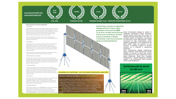 EasyVerticalPV to innowacyjny system fotowoltaiczny oparty na pionowym montażu bifacjalnych paneli PV, które zapewniają równomierną produkcję energii w ciągu całego dnia. System ten zastępuje tradycyjne instalacje fotowoltaiczne oparte na panelach monofacjalnych montowanych pod kątem, które charakteryzują się zmienną wydajnością, zależną od kąta padania promieni słonecznych. W klasycznych rozwiązaniach, szczytowa produkcja energii przypada na południe, co nie zapewnia pełnego wykorzystania potencjału w ciągu całego dnia. EasyVerticalPV umożliwia efektywne działanie w trudniejszych warunkach terenowych i klimatycznych oraz maksymalizuje produkcję energii na ograniczonej przestrzeni, eliminując potrzebę magazynowania energii. Dzięki wykorzystaniu innowacyjnego systemu fundamentowania EasyFootings, instalacja wymaga mniej materiałów i generuje mniejszy ślad węglowy w porównaniu do tradycyjnych fundamentów betonowych. System ten w krótkim czasie może zastąpić dotychczasowe, mniej wydajne modele instalacji fotowoltaicznych, zwłaszcza w miejscach o ograniczonej dostępności przestrzeni lub w regionach, gdzie nasłonecznienie jest zmienne. Ze względu na łatwość instalacji i niskie koszty początkowe, EasyVerticalPV może być szybko wdrożony na szeroką skalę, zarówno w domach jednorodzinnych, jak i w większych instalacjach przemysłowych, przyczyniając się do zwiększenia efektywności energetycznej w krótkim okresie kilku lat.